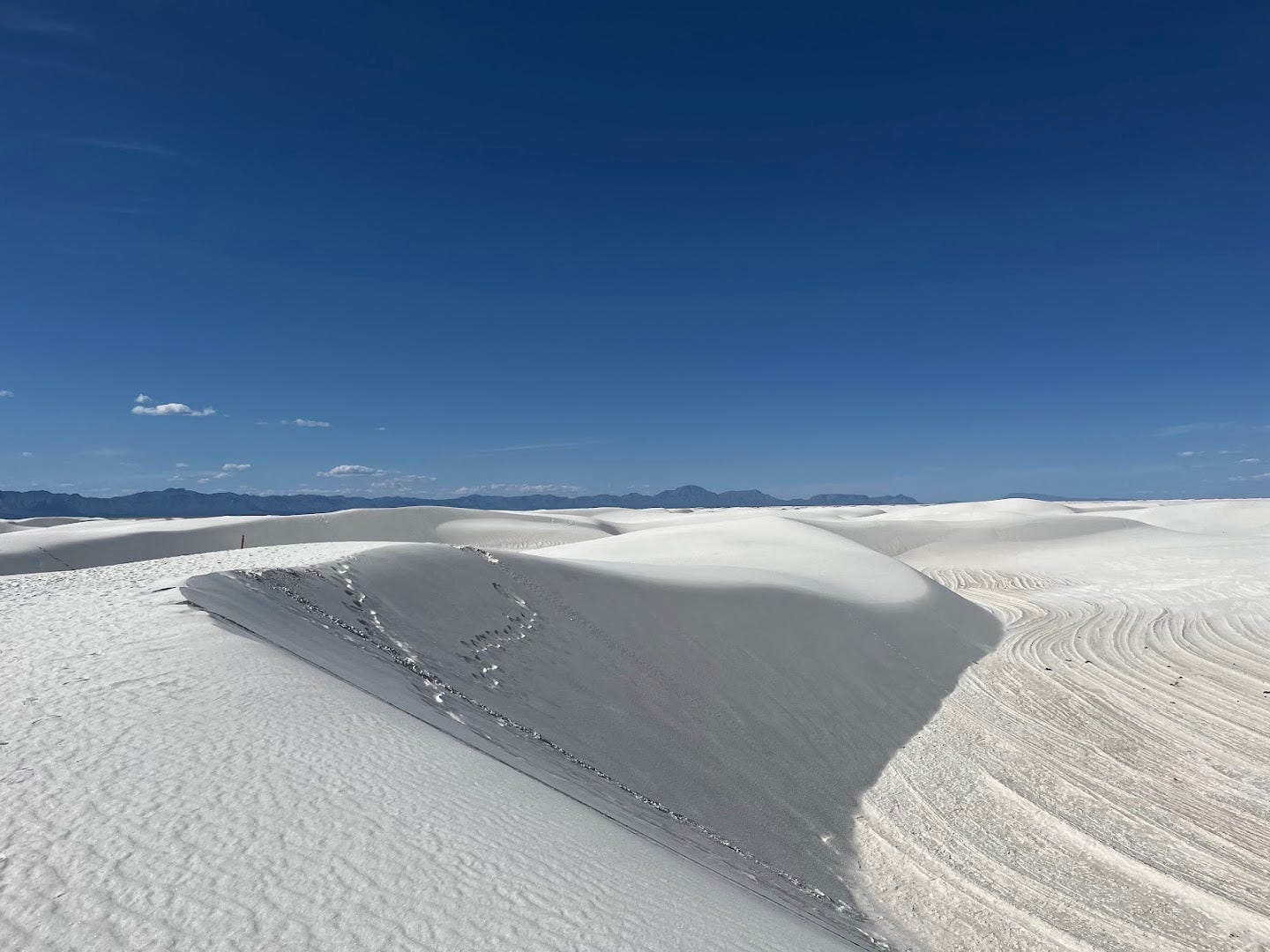 We made a weekend trip to visit two drastically different but equally astonishing landscapes. Our first stop was White Sands National Park where we entered an otherworldly, dream-like expanse of shimmering white gypsum sand. We practiced our Dune sand-walking and running down the sides of massive dunes. As the park ranger warned, we are still finding grains of white sand on our clothes and shoes to this day.